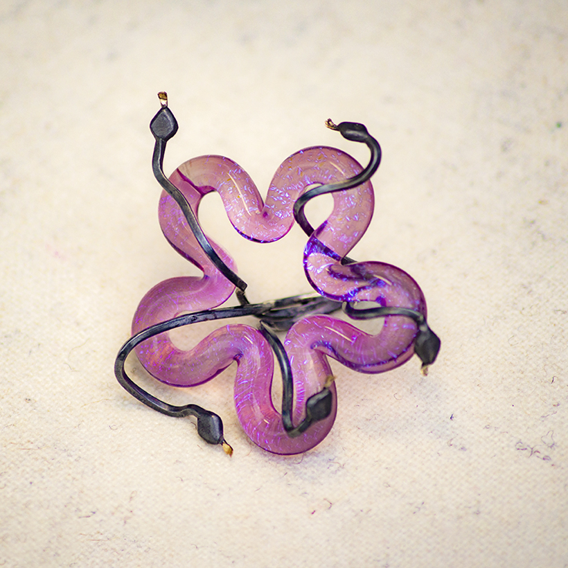 Este anillo encierra una flor púrpura nacida del fuego, rodeada por cinco serpientes forjadas en vidrio dicroico. Las serpientes no son guardianas, son amenazas. Representan los miedos, los peligros y las voces que intentan impedir que florezca.