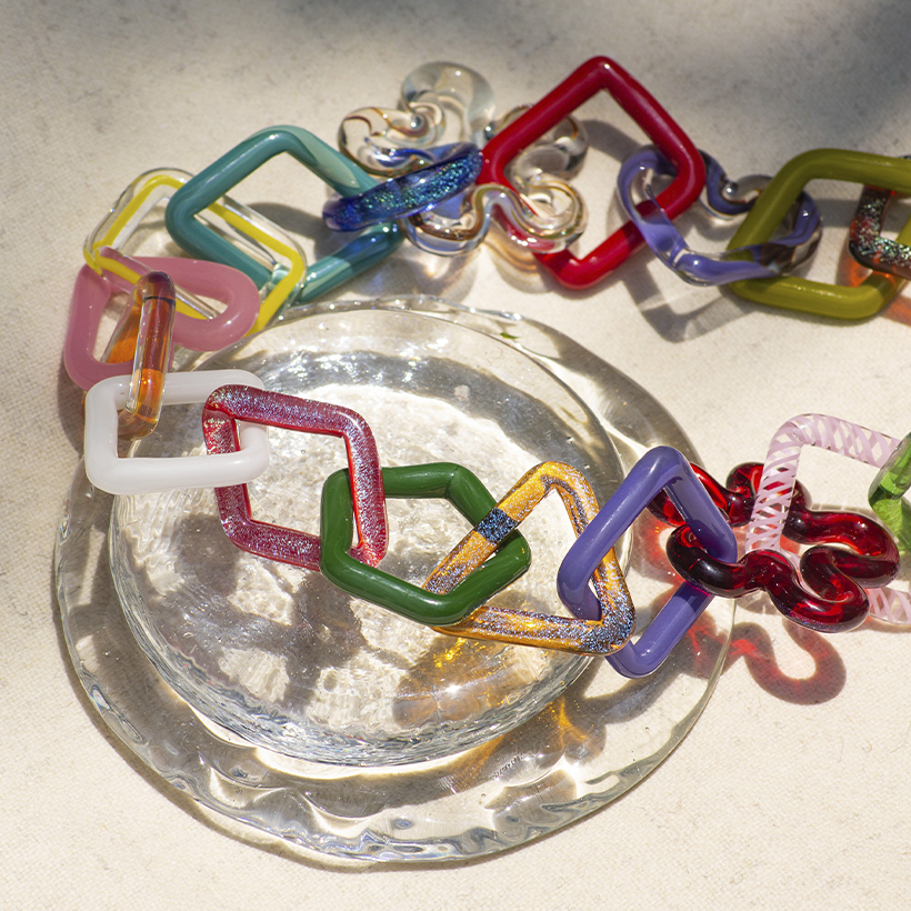 Este collar está inspirado en un juego de la infancia llamado “La Vuelta al Mundo”. Cada eslabón de vidrio representa una personalidad humana: algunos son cuadrados y rígidos, otros más suaves como un corazón, reflejando la diversidad de personas que conocemos y mi propia naturaleza multifacética y en constante cambio. Creado con diversas técnicas de trabajo en flama, vidrio dicroico, transparencias, colores reactivos a la llama y plata encapsulada, celebra las etapas de la vida y la felicidad, como flores que florecen a lo largo de nuestro viaje sin fin.