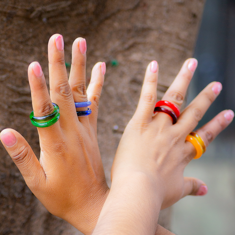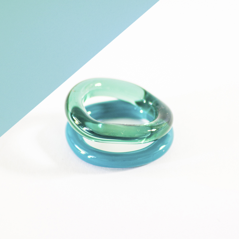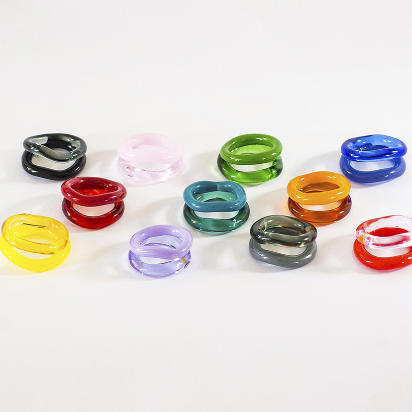 Cada uno combina dos aros: uno opaco y otro traslúcido, trabajando juntos como contraste y complemento, como si se tomaran de la mano. Están hechos completamente a mano con vidrio al soplete, por lo que no existen dos idénticos, y su forma fluida se adapta con comodidad al dedo.