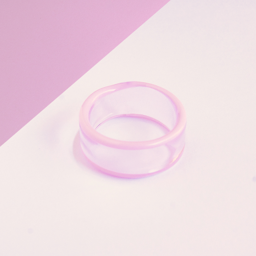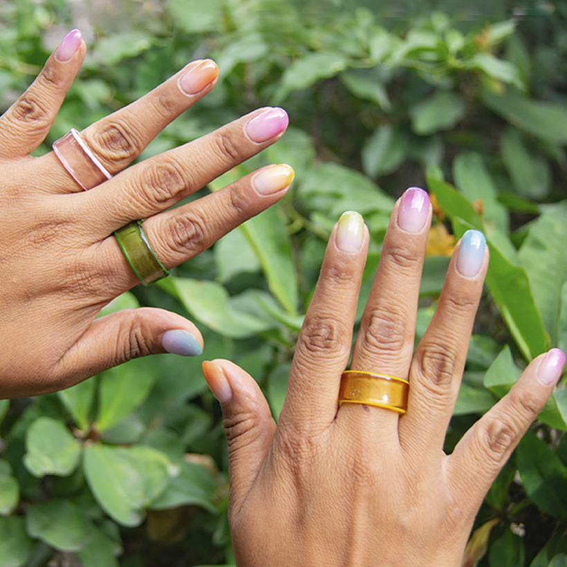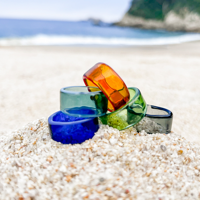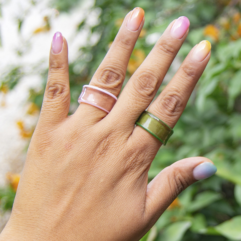 Estos anillos tipo listón están hechos a mano en vidrio traslúcido, con un toque de color opaco en las orillas que enmarca la luz de manera delicada. Su diseño plano y cómodo se adapta con facilidad al ritmo diario, sin perder presencia ni carácter.
