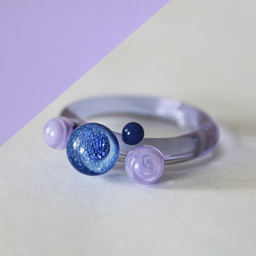 Hecho con vidrio de borosilicato y vidrio dicroico, éste provoca destellos y refleja la luz con un resplandor iridiscente que cambia según el ángulo y con pequeñas aplicaciones esféricas que te hacen pensar en el espacio.